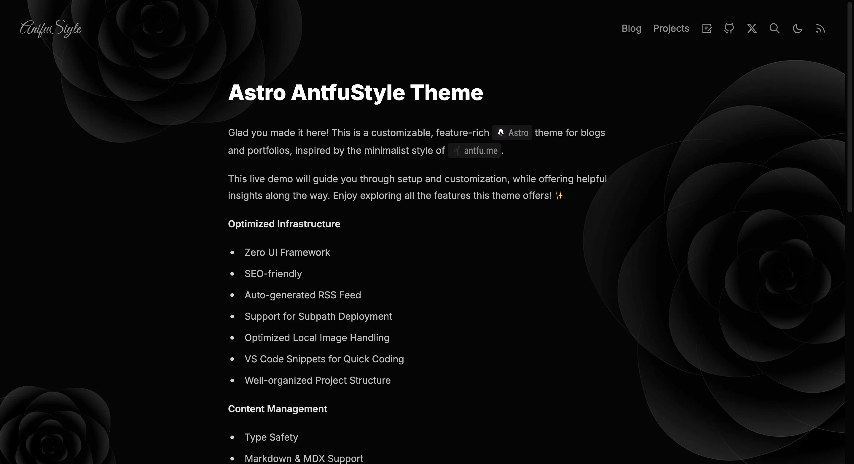 This post introduces some handy tricks for using special syntax in the Astro AntfuStyle Theme to enhance your Markdown/Mdx content. These shortcuts let the theme’s built-in integrations or plugins handle the heavy lifting, automatically converting everything into HTML --- no need to write complex code yourself! 🎨